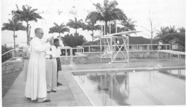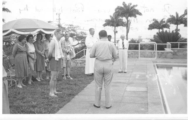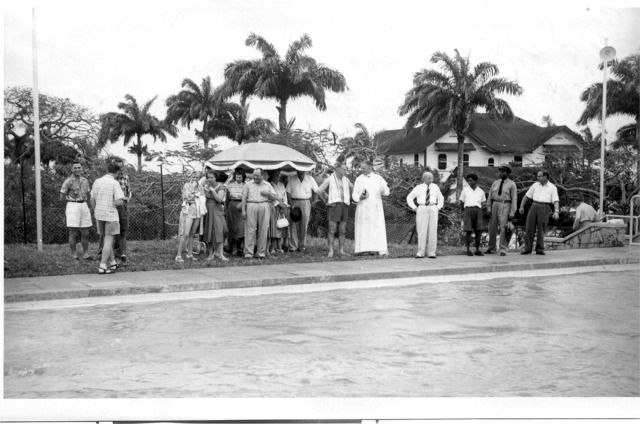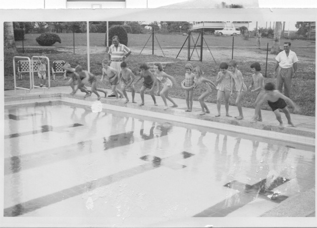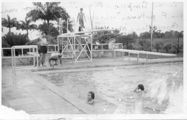 In the pic at left the pool is now in full use, everyone doing their own thing. Can't make out anyone....Jean Merry in the pool perhaps, but an important pic for me because I can see our favourite old Brighton home in the background. As I sit here today putting this together, it is 6.00am and the rain is falling outside , it is dark as we wait the arrival of tropical storm Earl and it invokes memories of the rain falling at Brighton, the shutters down, the house dark, the melody of the falling rain soothing us in to an almost hypnotic state, the blue lights in the high ceilings turned on and what a wonderful safe feeling it was. Even though we couldn't go outside to play, we were happy to be indoors and always found all sorts of adventures inside. It was here that Mrs. Sturn's ghost visited me one night, where we had our rig in the mango tree, where we kept two chickens, Becky and ??, where Lassie from Coon's Town killed my rabbit and was immediately forgiven, where I shot and killed a sparrow with my new bow and arrow, where I got blown across the kitchen floor while lighting the oven for Mum, where I got a bad cut on my finger while trying to open the Borden tube on a pressure gauge with a hammer, shot Gillian in the elbow, my first aquarium full of fish from the golf course, pink bathroom with high ceilings and a skylight in the roof, and much much more, too much to record. Alas the house is all gone, it burned down and the empty lot all ploughed up and rough is all that is left. When I die the importance of these memories die with me, there will be no tangible markers of that time left, they will all have been ploughed under by man's ambitious plans.