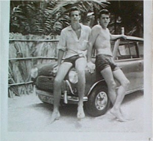 The "bad-boys" section....Pete Fernandes and Douglas Bayne lounge coolly on someone's Mini at Why worry in Mayaro. Note Douglas' triceps built up in Glen Nicholson's gym which was right next door to where Dus lived. Yours truly glowers out of his first passport picture which would have made the time of the pic sometime in the very early sixties.........baaaad boy!