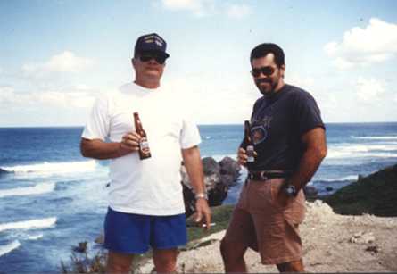 Warms my heart to see these two together, even for a short while.....both good friends and a big part of what I am......Chris Taylor and Peter Hughes stand at Bathsheba or Cattle Wash on Barbados' exciting East coast, nursing two bottles of low-cal health drink.........yeah......and sharks don't bite.