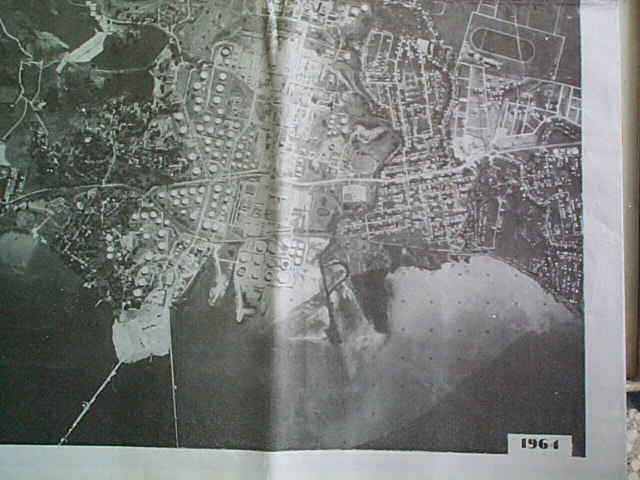 In the next pic, taken in 1964 by a reconnaissance aircraft from 58 Squadron RAF, the same year that it was published, the view is more like we knew......St.Pete's is there, the Club, Guaracara Park, the roundabout and Admin' building, The Avenue, No 5 Reservoir dam wall, Lube Oil Jetty, The horse racing park in Marabella.....Wow!....a lot happened in 26 years.