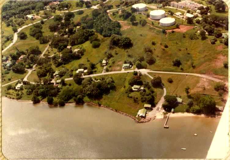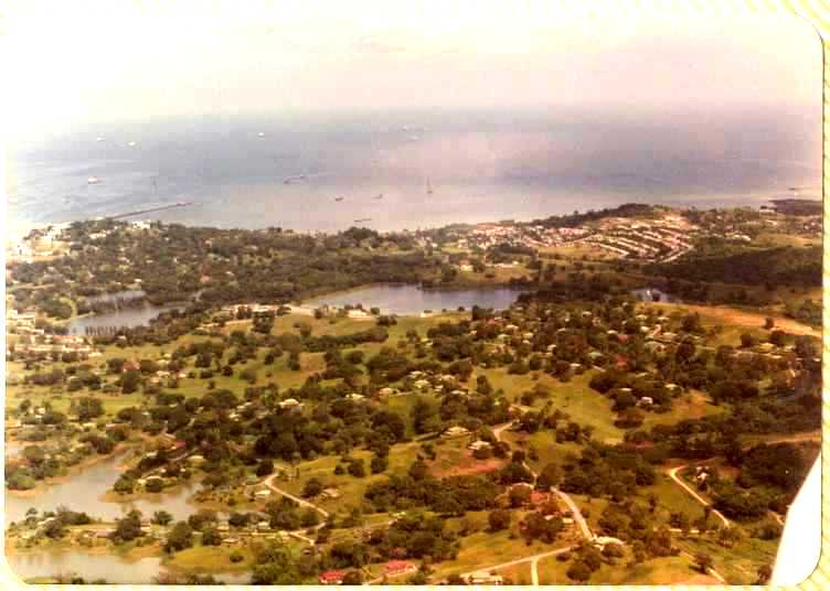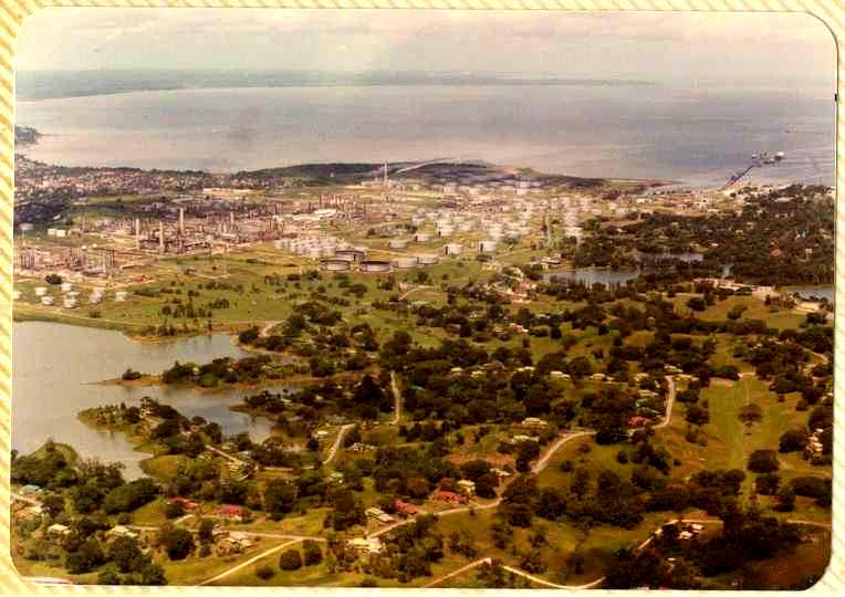 In this very panoramic shot there is a lot to see so I'll try to fill in a few markers and you can fill in the spaces....top left is the Lube Oil Jetty. Below is just a hint of No 2 reservoir (Regent Road side), then next to it nearer towards the middle is No3 dam (the one near No 1 Mess and on the other side of the spillway), going right of course is the club and No 5 Dam with the dam wall. Coming down to the lower left corner is No 4 dam, Roble and Cedar avenues. About middle is the Samaan/Tamarind avenue......Mango is already turned in to golf course, and the old wooden bungalows in Bay avenue are still up....I can see my old wooden home at 4 Bay and the concrete one at 3 Bay......remember my white Austin Healey Sprite - PE1912.