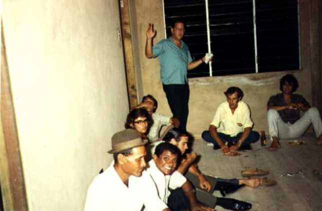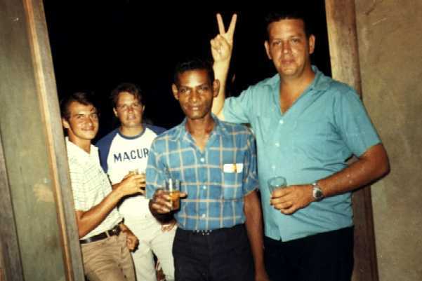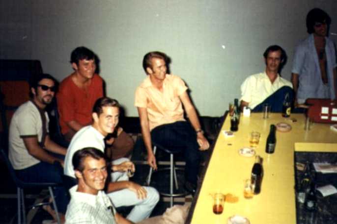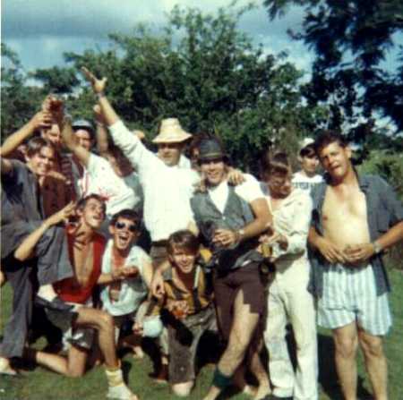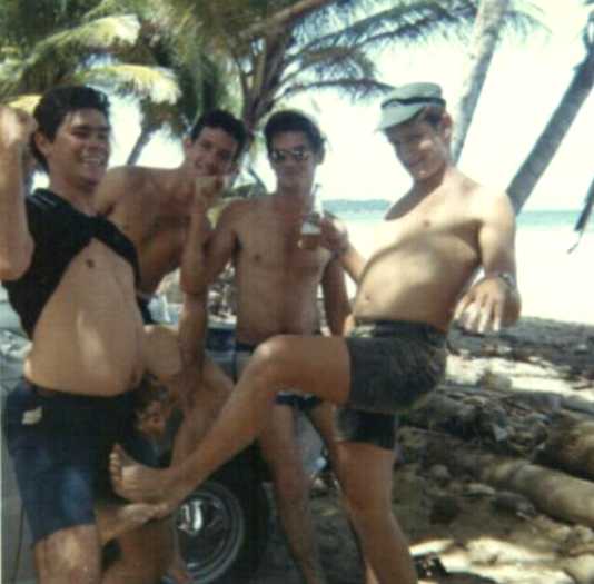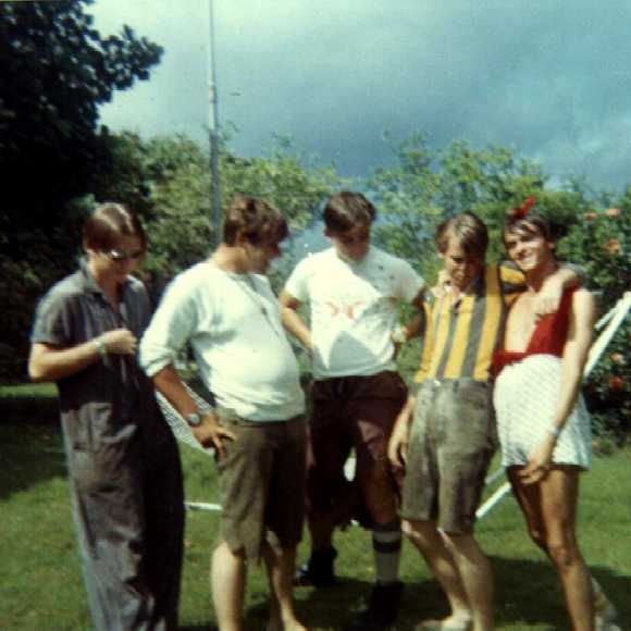 Now, what have we here......a drinking lime maybe. From left - Yours Truly (so I am advised), Alan "Rent" Rostant, ????, Ronnie Hadden, and a loose lady from the village.....just kidding, really Randall Bayne. The legs are what probably had me looking desperately away from the side.