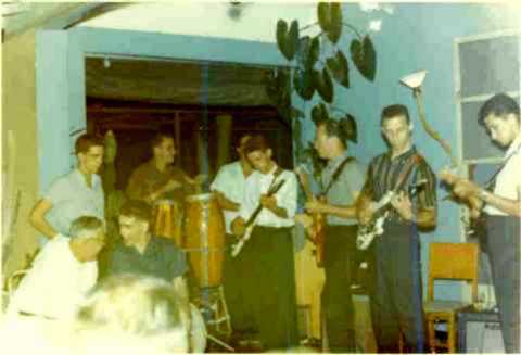 The best I could do to re-touch this great pic, a shot of one of the bands. I don't know where and when...help anyone? Going to guess at some of the people...on tombas Wayne Alleyne, looking down at white guitar Sid Johnson, maybe Hugh Robertson, how about Ronnie Fortune, and of course Stan Soodeen. That's it, help on the rest please. Got some help from Dale himself - in the little triangle on the left of the picture is Dale himself (standing), Father Zuibert and Ian "Sploosh" Gibbon sitting........thanks Dale.