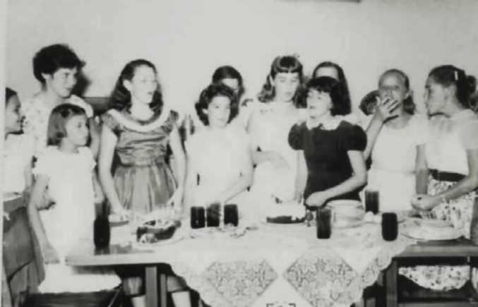 In this pic of Liz's 13 (??) birthday - From Left - Madeline Smith, Valerie Hughes behind Angela in front, Anne Galbraith, Pauline Nelson, Desiree Parsons hidden behind, Diana Becerra, Liz (birthday girl), Catriona Finlayson hidden behind, Joan Hollis, and Ginger Bower. Cheers Angela.