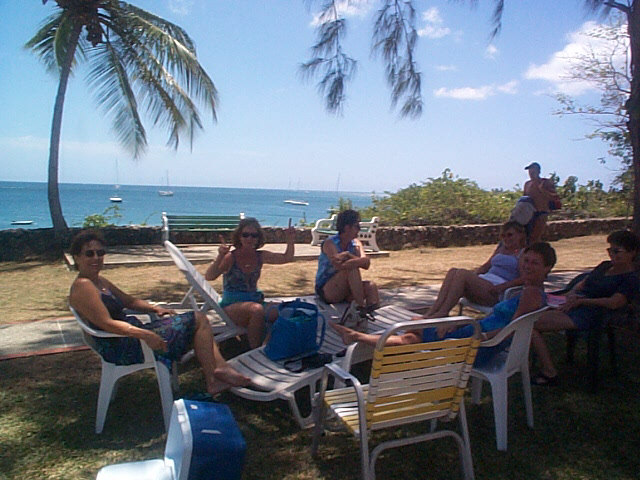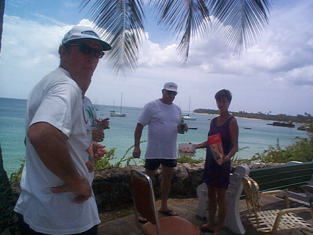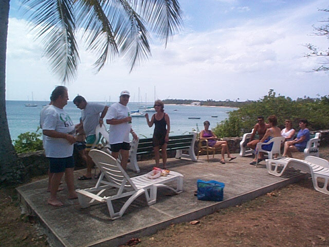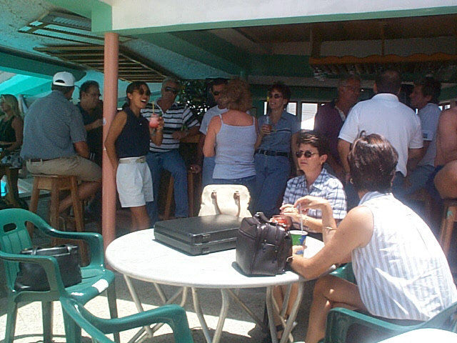 From left - Alec Ward (back to camera), David Inglis, Di Pontifex standing against the pole, Chris Taylor, Peter Hughes, Sandra Ward (back to camera...shy people these Wards), Joan Taylor, Sandra Johnson sitting at table with Donna Darwent, Roddy Gibbons, Des Pontifex with back to camera, and Douglas Bayne. Wes and Chris had not yet arrived from Barbados.