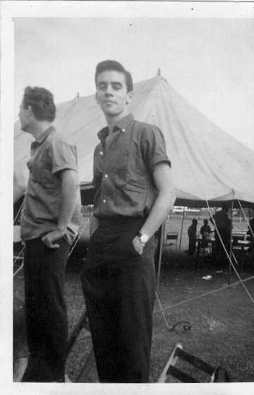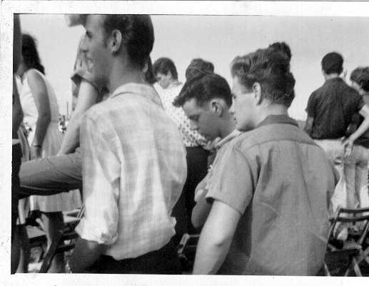 Same Kiddies Carnival, Robin "Stork" Storey enjoys something that the camera has not picked up, David "Sniggs" Inglis thinks about his last missed put, and Mike Devin takes in the scenes quietly. It looks like Peter "Haggis" Hughes' head between Robin and Sniggs, and to Mike's right, Raymond Westmorland in dark shirt and light pants.
