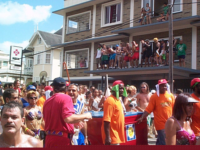 A common sight on both days is young people up on walls strutting their stuff and "wining dong de dam place".....these happy nut-cases outdid themselves for sure.....what a time!!! In the 2000 Carnival series I got the red jerseys of the security detail and the green of our medics....I missed the orange of the cart pushers and tenderers...."maaaan! you just don't try to put yuh han' in one of dem carts widout a rist ban'".....dey go break it.