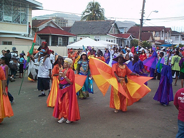 As much as I don't like his pomposity and regard him as Trinidad's number one cultural con-man, Peter Minshall's band Picoplat, made an absolutely breathing sight coming down Cipriani Boulevard on Tuesday......what fantastic use of colour and materials. Sorry I didn't have a better lens.