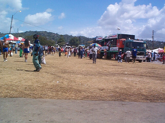 Here the inlet side of the Savannah (Jerningham Ave./Memorial Square side) is just beginning to fill up Monday. Costumed people going in all directions looking for their band........everyone helping the other with advice as to where they can find their band........wonderful network....people really seem to know where each band is once the band is heading for the stage. Not visible in this pic, but behind the monster music truck with the red cab was a broken down J'ouvert truck, still belting out sounds for the few mud covered and bedraggled supporters jumping up around it.